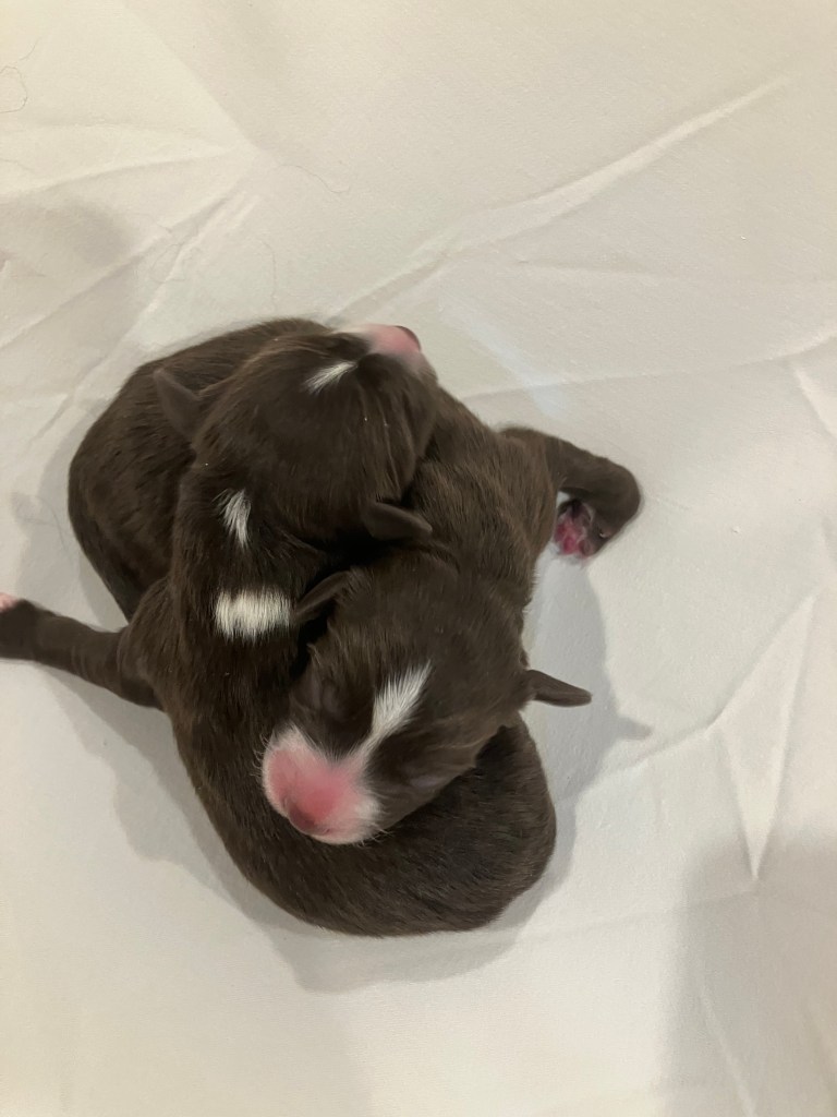 Born 1-13-23 10 babies! 2 blue females, 1 red Merle and 3 black. 1 blue Merle male, 1 solid red and 2 black. Lovely white and copper trim across the board!
